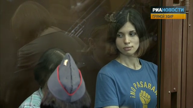 | Defendant Nadezhda Tolokonnikova in the "aquarium" wearing an anti-fascist t-shirt |